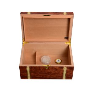 Настолен хумидор за 40-75 броя пури. Вътрешност от първокласен испански кедър, изсушен в пещ, с технология SureSeal ® за осигуряване на правилното уплътняване на капака при затваряне. С включени влагомер, овлажнител, регулируеми разделители и ключ. Размери 35,5 × 23,5 × 17 cм.