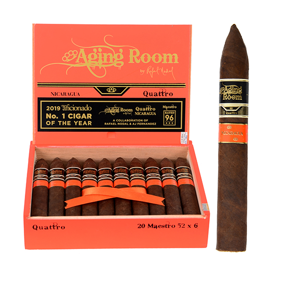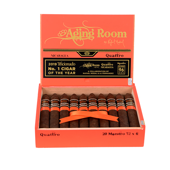 Пурите Aging Room Quattro Nicaragua са сътрудничество между Boutique Blends с мастер блендер Rafael Nodal и Tabacalera AJ Fernandez, направени във фабриката им в Никарагуа. Линията Quattro на Boutique Blends е най-успешният им проект до момента. Предлагат се във витола Maestro, бокс-прес с форма торпедо , размер 6″ x 52. Забележителна пура, покрита с кадифен, наситено кафяв обвиващ лист Nicaraguan Sumatra. Свързващият тютюн и пълнежа също са никарагуански, но всички допълнителни подробности за сместа се пазят в тайна. Силна и пълноценна пура,с нотки на шоколад, кафе, червен пипер и земя. Финият баланс на сладки подправки и земни нотки, заедно с идеалната скорост на изгаряне и температура, правят тази пура достойна за титлата Пура №1 на 2019 година.